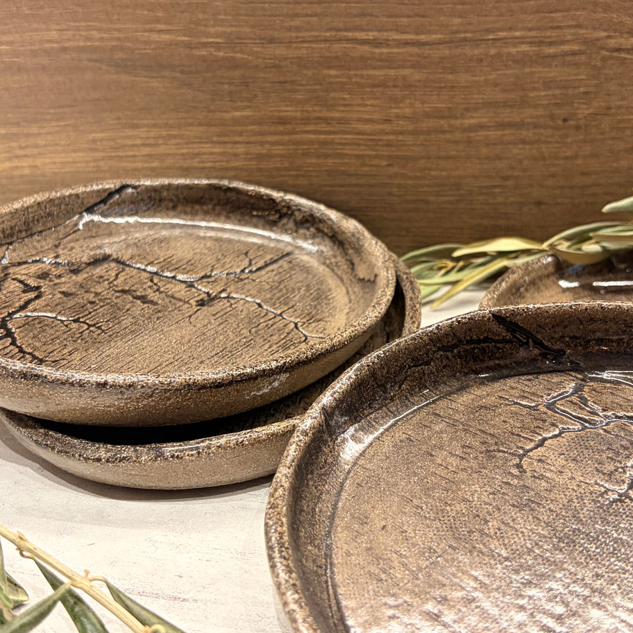 סדרת צלחות אובליות בעיצוב מיוחד של עץ בלי עלים בצבעי חום שחור ואפור