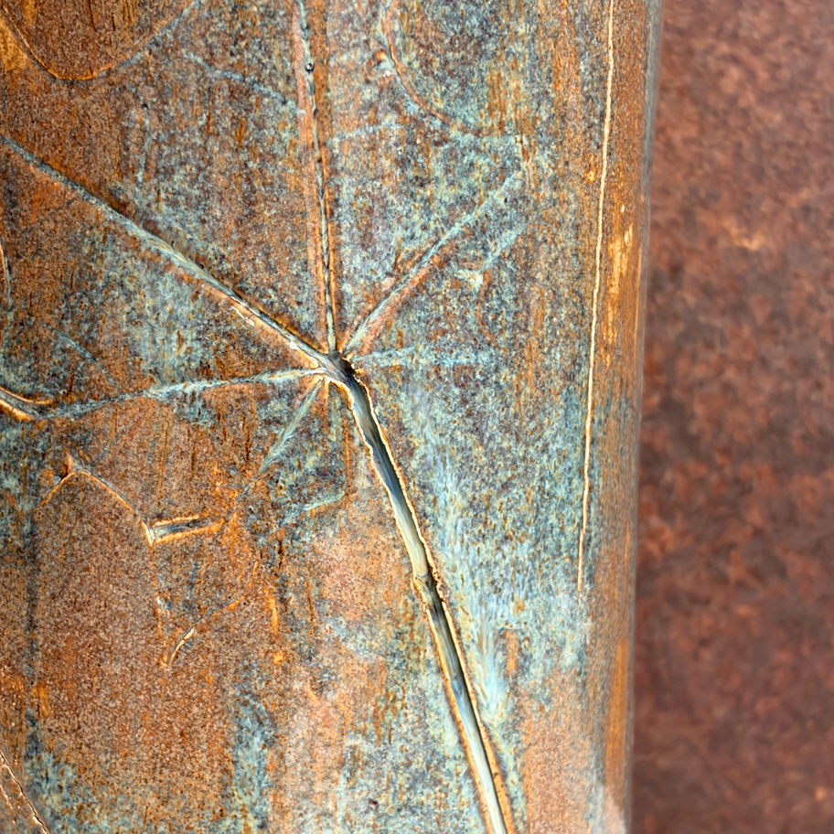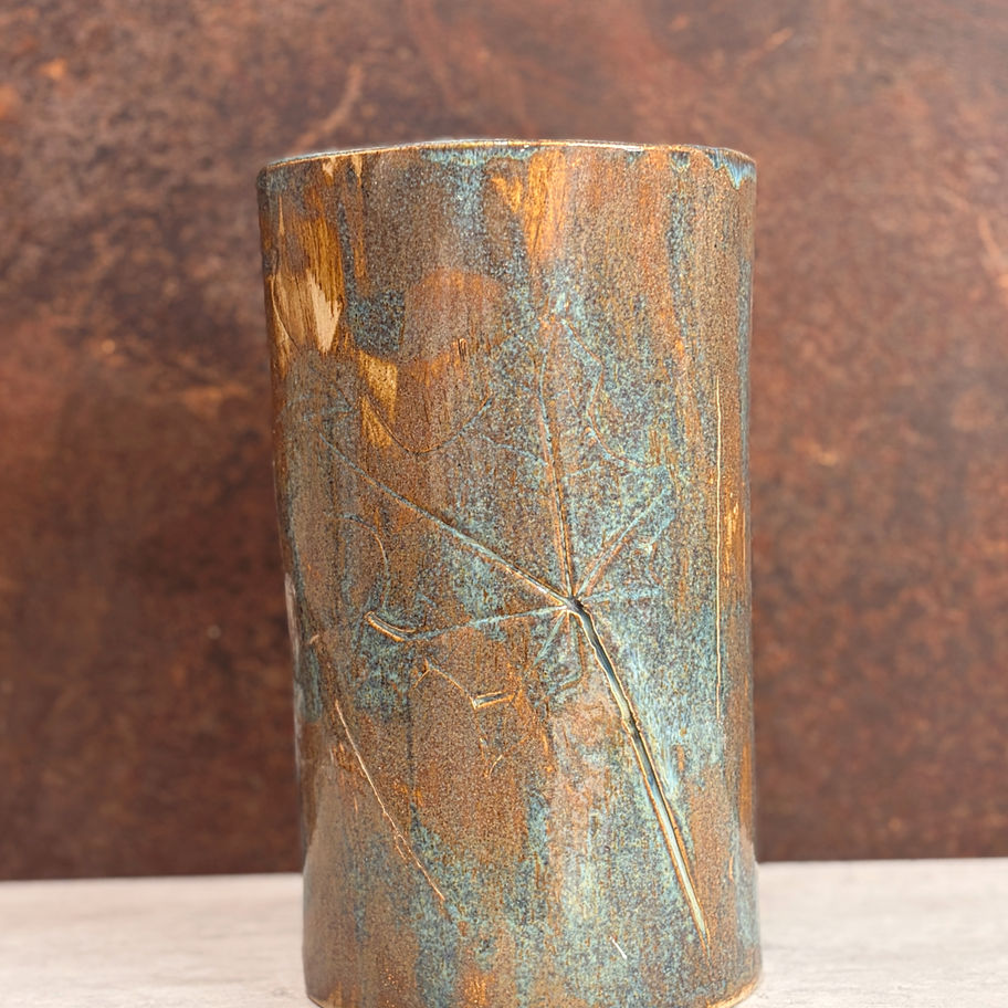 כד מיוחד בעיצוב צבעים משולב כחול וחום בנוסף לתביעת צורתו של העלה לכל אורכו