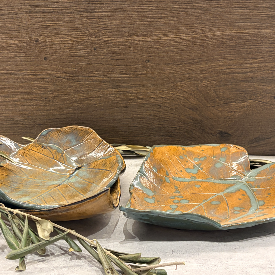 סדרת צלחות הגשה מיוחדות בעיצוב עלים בגווני צהוב ותכלת
