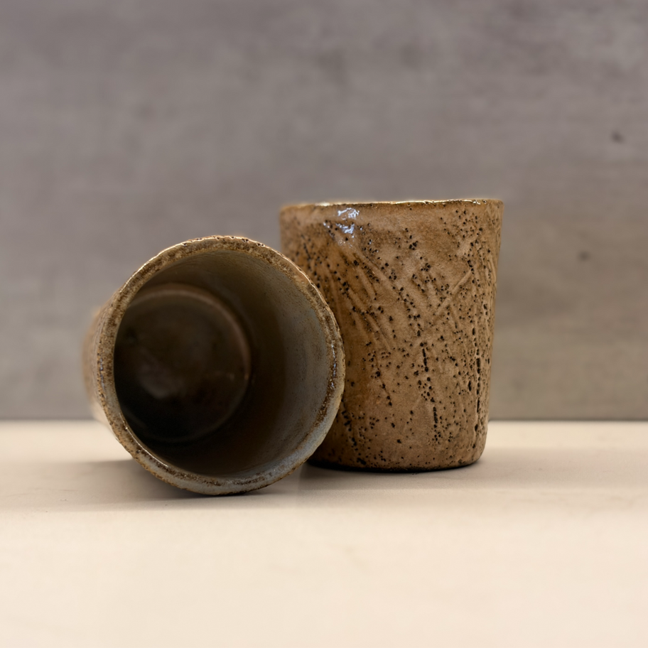 סדרת זוג כוסות אספרסו בעיצוב מדברי ומיוחד בטקסטורה משולבת של פסים ונקודות.