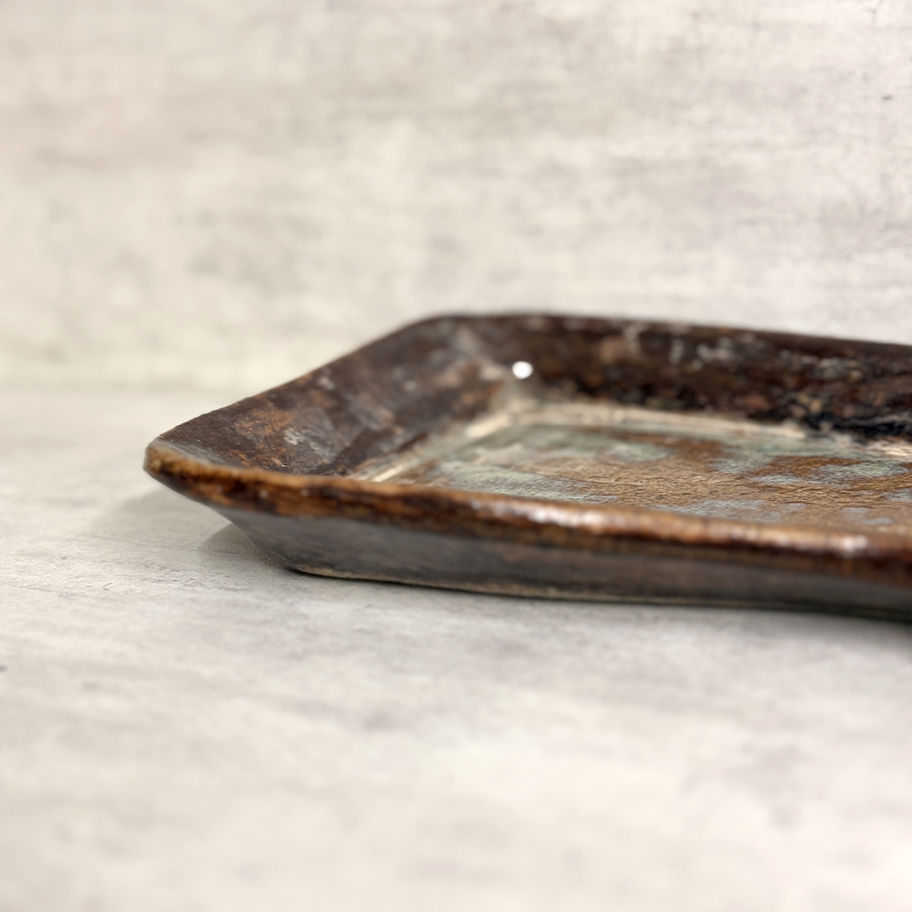צלחת הגשה גדולה עם עצוב ייחודי בצבעי סגול כהה , חום בהיר וטורקיז- שילוב צבעים לא שגרתי שמוסיף חיים לכל שולחן